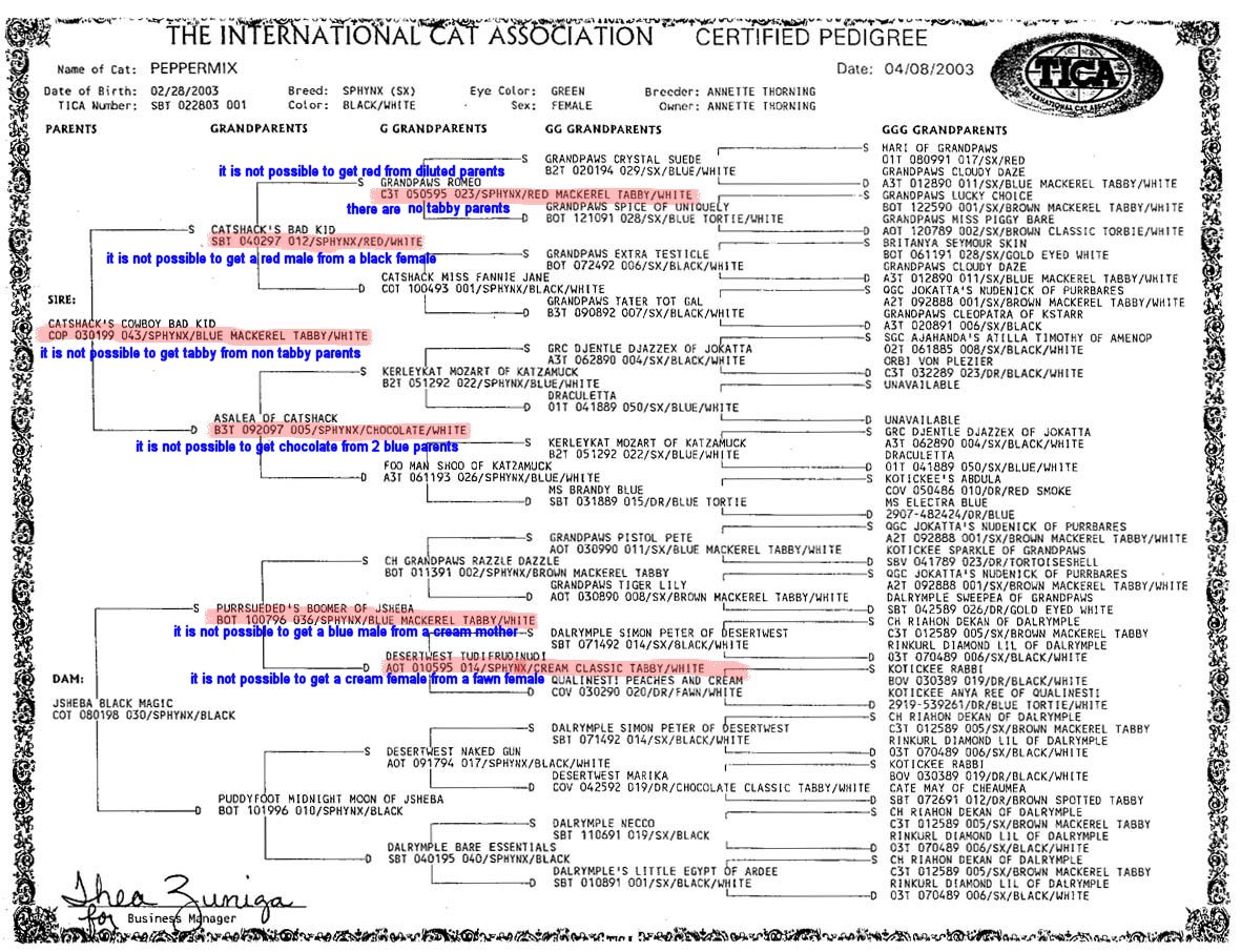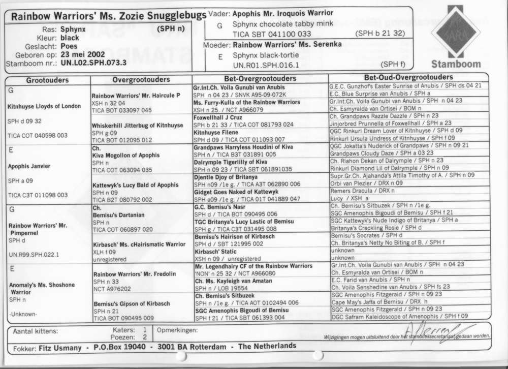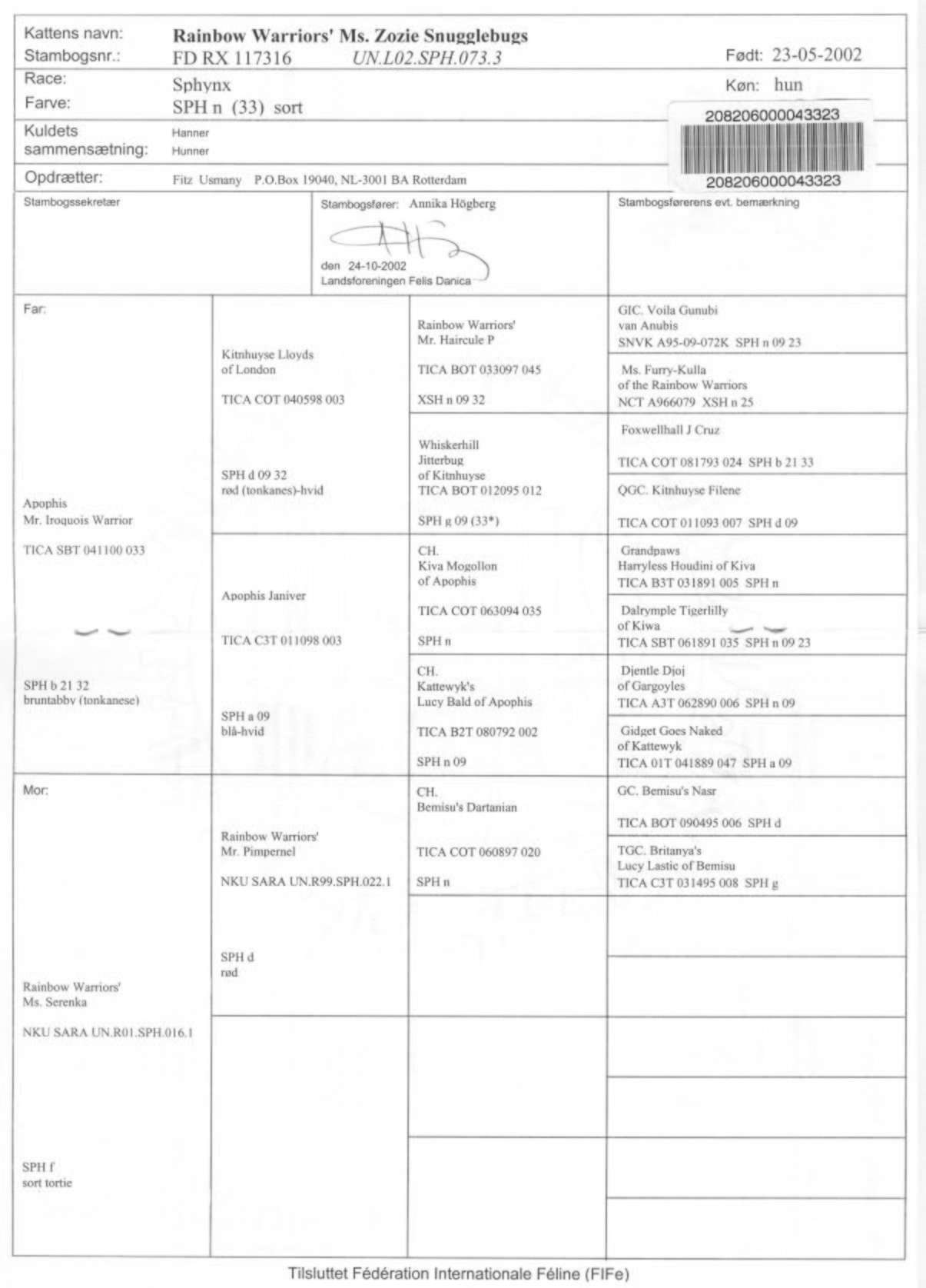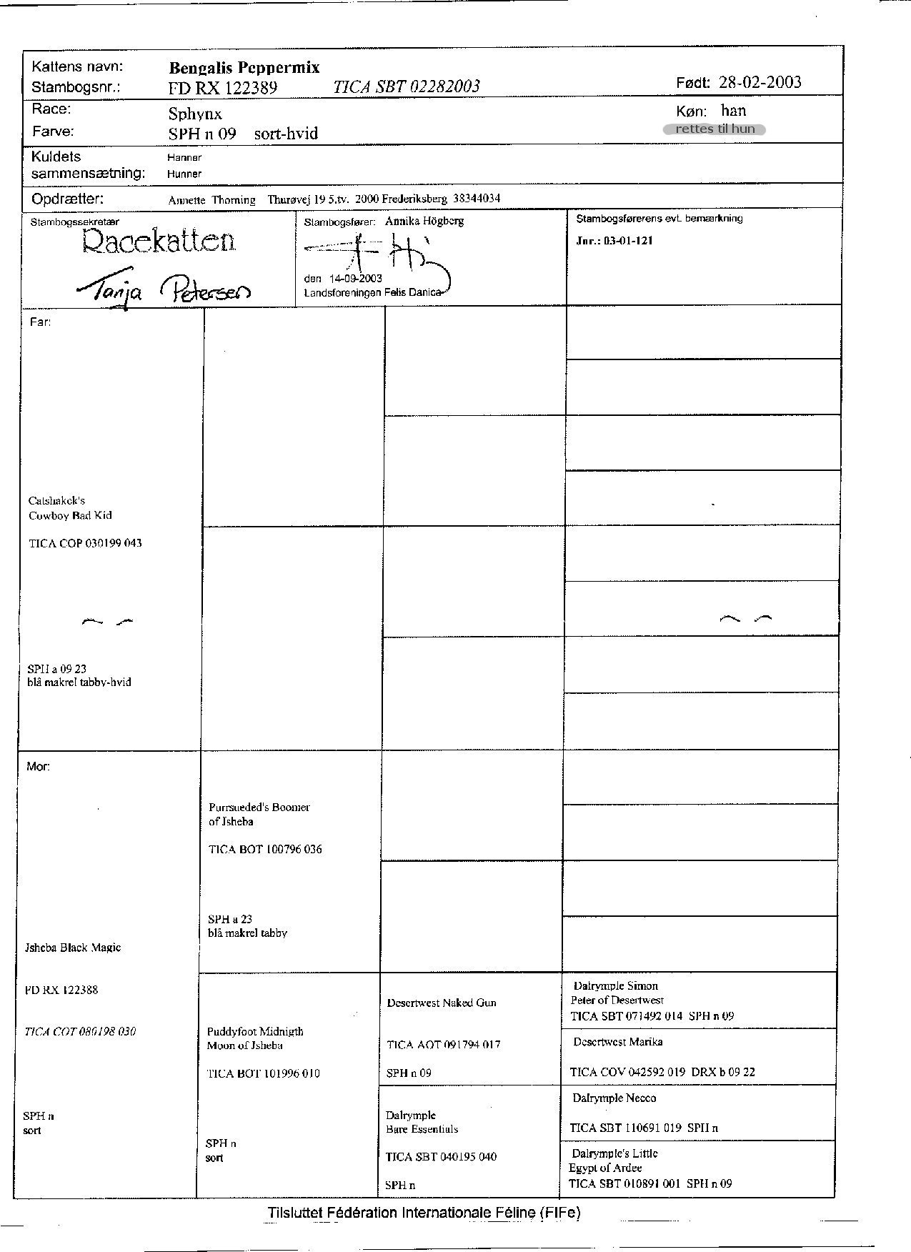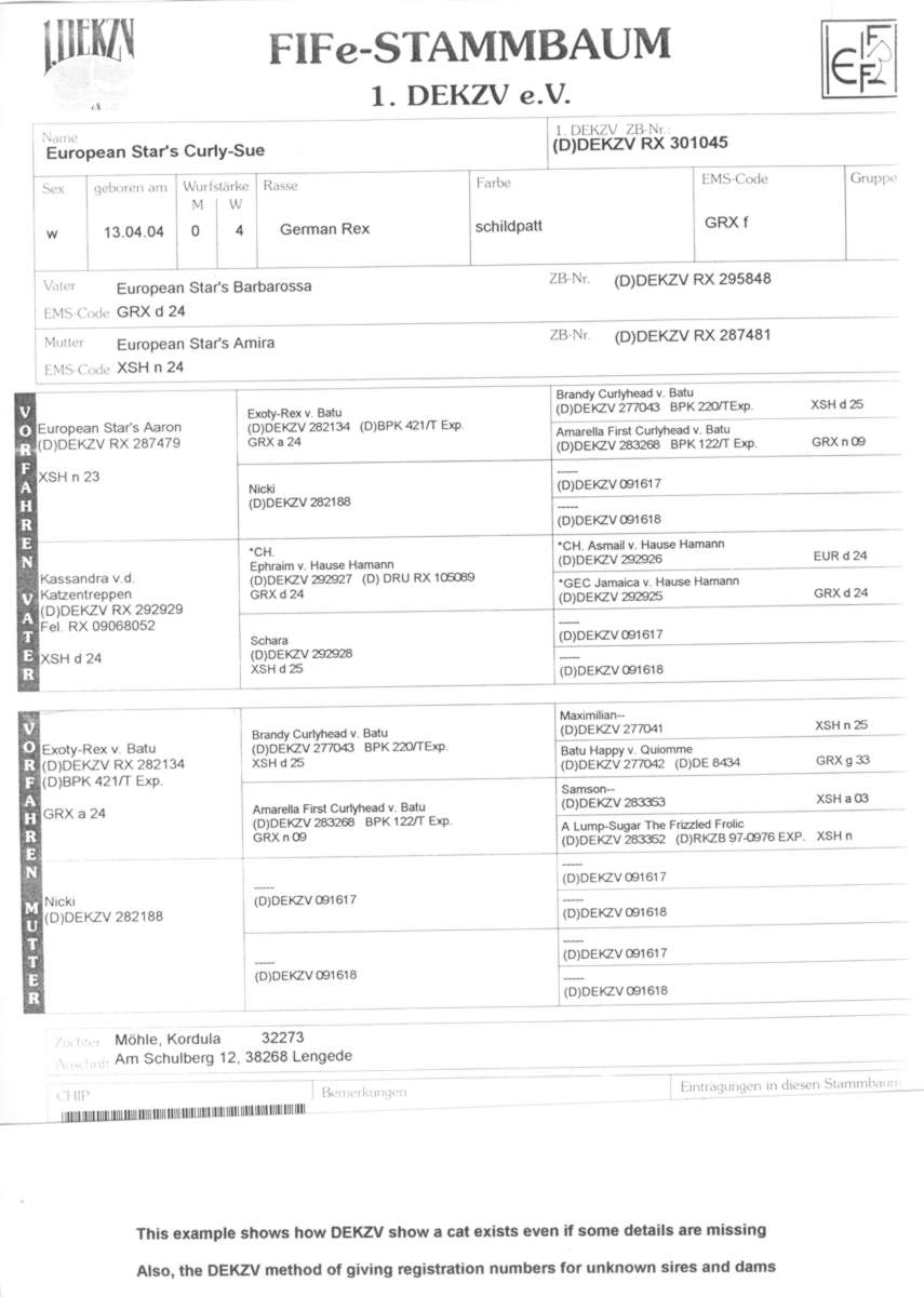 Scan of original NKU pedigree for Zozie Scan of FD pedigree for Zozie Scan of original TICA pedigree for Peppermix Scan of FD pedigree for Peppermix Scan of an example DEKZV pedigree (Early version - later versions now have even better detail) |